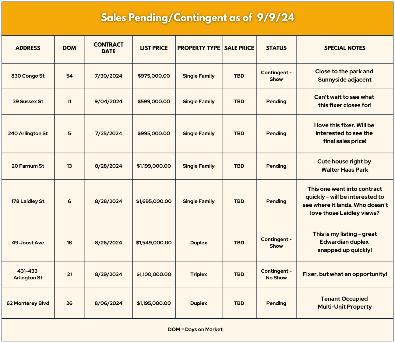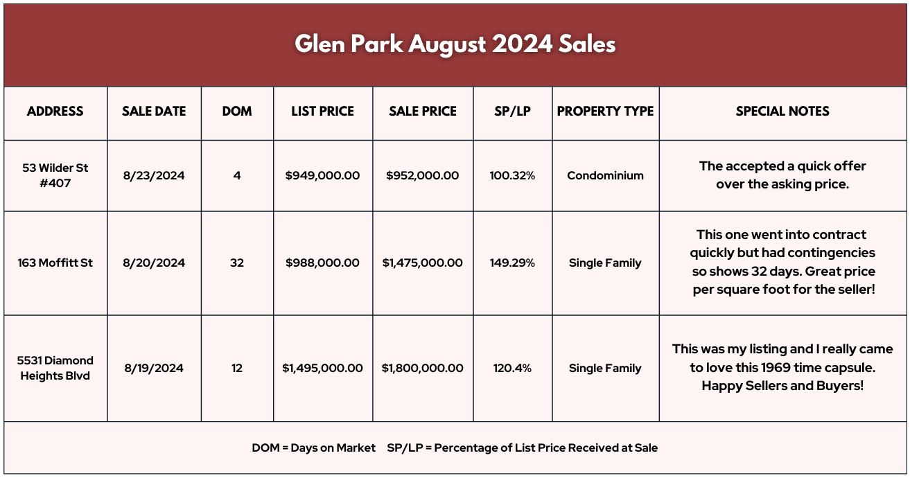 Now, for the Glen Park Transactions/Listing for the month of August: