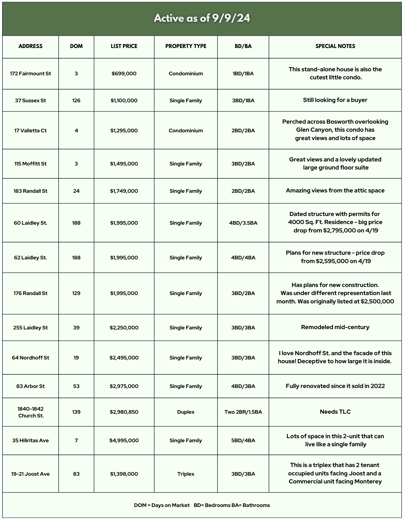 Greetings Glen Park! We have now moved solidly into the post Labor Day fall market in San Francisco. Lots of inventory has been popping up along with quite a few “Coming Soon” properties that are not yet viewable to the general public. Other places that I look for indications that inventory is on the rise are also showing signs of more incoming inventory – stagers are booked, inspectors are very busy, lenders are seeing their business picking up (though some of that is refinancing business that is finally coming back). Sellers don’t need to fear that the market is going to be flooded. We have had a dearth of inventory for a long time, but we also had a diminished buyer pool to match the lack of inventory. With interest rates finally falling back down to earth (now closer to mid-to-low 6’s instead of close to 8%), buyers are feeling more confident about being able to make monthly payments for a home they’d like to live in rather than having to compromise on too many of their “want” and “need” to haves.